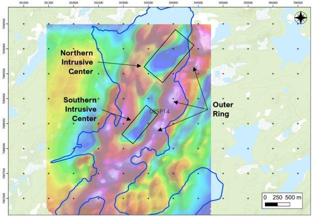 Die Auswahl der Bohrziele wird durch gut ausgebildete Magnetfeldstrukturen begünstigt, zu denen eine markante ringförmige Anomalie mit hohen Magnetfeldwerten sowie mehrere innerhalb liegende Zonen mit niedrigen Magnetfeldwerten zählen. Letztere werden als abgegrenzte Intrusionszentren gedeutet, die entlang eines von Nordosten nach Südwesten verlaufenden Entwicklungszugs angeordnet sind. Der Bohrplan sieht vorrangig die Exploration des nördlichen Intrusionszentrums vor, von der sich das Unternehmen eine zuverlässige Ersterkundung eines ausgedehnteren Systems verspricht.