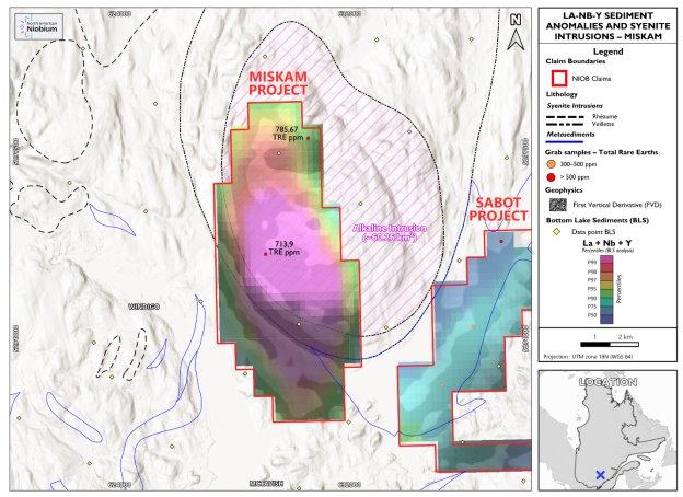 Das Unternehmen hat etwa 4.222 ha Land, bestehend aus 73 Mineral-Claims, 45 km nordwestlich von La Tuque in Quebec („Miskam“), abgesteckt. Die Übertragung von 21 der 73 Mineral-Claims steht noch unter dem Vorbehalt einer Genehmigung. Das Konzessionsgebiet befindet sich etwa 2 km westlich von Sabot und weist ähnliche geologische Gegebenheiten auf. Die von der Regierung bei Miskam gesammelten, äußerst anomalen Seebodensediment- und Gesteinsproben stimmen mit den kartierten syenitischen Intrusionen und dem günstigen Wirtsgestein überein (siehe Abbildung 1) und unterstützen ein silikatisch-alkalisches Explorationsmodell für eine Niob-Seltenerdmetall-Mineralisierung.
