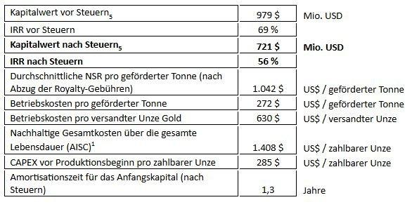 –          Das Basisszenario mit einem Goldpreis von 3.200 $/oz ergibt eine interne Rendite („IRR“) vor Steuern von 69 % (56 % nach Steuern) und einen Kapitalwert („NPV“) vor Steuern bei einem Diskontsatz von 5 % in Höhe von 979 Mio. US$ (721 Mio. US$ nach Steuern).