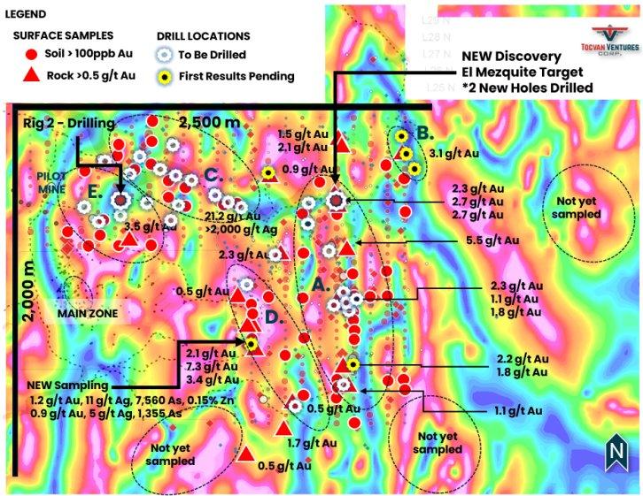 Oberflächenprobenahmen im Central Magnetic Trend (siehe Abbildung 1. Zielgebiet D) lieferten Werte von bis zu 1,2 g/t Au, 11 g/t Ag sowie erhöhte Gehalte der Pathfinder-Elemente As und Zn, was auf eine epithermale Mineralisierung im oberen Bereich hinweist.