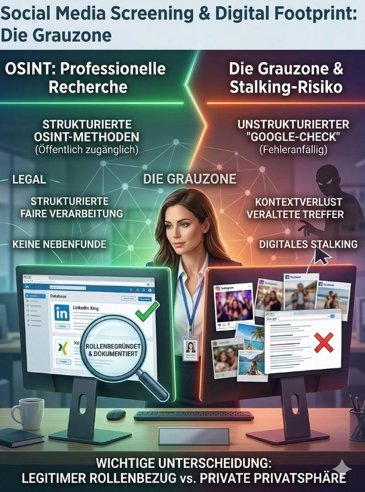 OSINT-Ergebnisse ohne Kontext sind gefährlich. Namensgleichheiten führen zu Fehltreffern, veraltete Meldungen können irreführend sein, und Inhalte privater Natur müssen explizit aus der Auswertung ausgeschlossen werden. Professionelle OSINT im Screening-Kontext verlangt daher immer eine manuelle Verifikation von Treffern, eine klare Dokumentation der verwendeten Quellen und eine faire Chance für den Kandidaten, zu Ergebnissen Stellung zu nehmen.