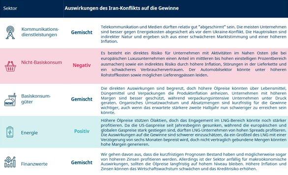 Wir gehen davon aus, dass die Gewinne europäischer Unternehmen im ersten Quartal relativ stabil bleiben. Da der Iran-Konflikt erst Ende Februar begann, dürften die Auswirkungen in den Berichten zum zweiten Quartal und darüber hinaus deutlich sichtbarer werden.
