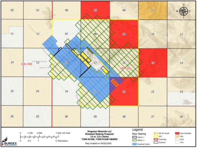 Kingman Minerals Ltd. (TSXV: KGS) (OTCQB: KGSSF) (Frankfurt: 47A1) („Kingman“ oder das „Unternehmen“) freut sich bekannt zu geben, dass das Unternehmen mit Hilfe von Burgex Mining Consultants 121 zusätzliche Erzgang-Claims im und rund um den Standort der historischen Mine Rosebud abgesteckt hat. Mit dieser beträchtlichen Erweiterung der Beteiligungen steigt der Grundbesitz des Unternehmens im Gebiet auf 192 Erzgang-Claims mit einer Gesamtfläche von 1.216 Hektar (3.006 Acres).