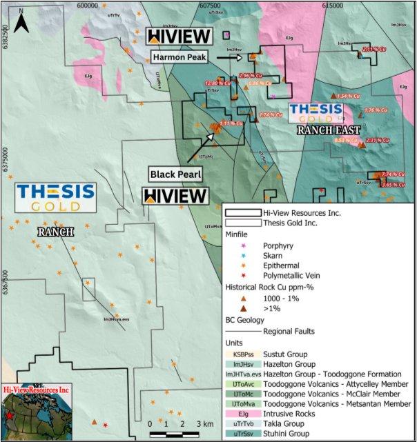 Vor kurzem gab Thesis Gold & Silver Inc. bekannt, dass es an zwei separaten Zielen eine porphyrartige Alteration identifiziert hat: Bei einem Ziel wird dies als Lithocap-System interpretiert, das einen potenziellen Porphyr in der Tiefe überlagert; das zweite Ziel weist eine innere propylitische Alteration mit Kupfer-Silber-Mineralisierung auf, die mit der Freilegung eines tiefer liegenden Systems auf Porphyr-Ebene übereinstimmt. Zusammengenommen deuten diese Ergebnisse auf ein Gebiet mit mehreren Porphyrsystemen hin, die sich in unterschiedlichen Erhaltungsstadien befinden – genau die Art von geologischer Umgebung, in der sich das Projekt Black Pearl nach Ansicht von Hi-View befindet.