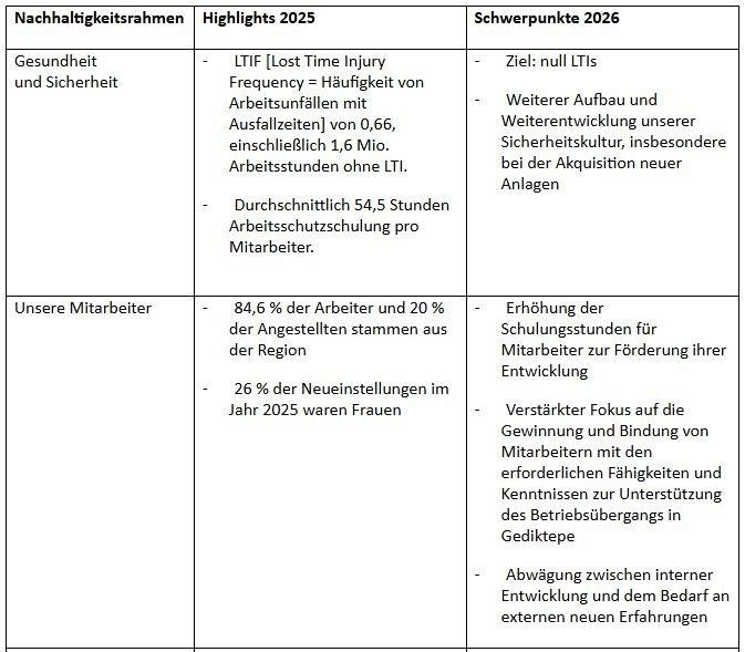 Der Nachhaltigkeitsbericht 2025 beschreibt den Ansatz des Unternehmens in Bezug auf Umwelt-, Sozial- und Governance-Themen („ESG“) und bietet einen Überblick über die Leistung in den Schlüsselbereichen Betrieb, Sicherheit, Umwelt und Gemeinschaft während des Berichtszeitraums. Der Bericht spiegelt den anhaltenden Fokus des Unternehmens auf verantwortungsbewusste Betriebsabläufe, die Einhaltung gesetzlicher Vorschriften und die langfristige Wertschöpfung wider.