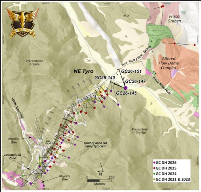 Die Bohrlöcher GC26-140, GC26-145, GC26-147 und GC26-151 haben das teilweise definierte Erzgangsystem bei NE Tyro um etwa 140 m in Richtung Nordosten erweitert und deutlich näher an die Verwerfung Frisco Mine sowie an die stark alterierten Lavadome und die damit einhergehenden Vulkangesteine von Frisco Graben herangeführt (Abbildung 1). Die vier Bohrlöcher, die Gegenstand dieser Pressemitteilung sind, umfassen 1.196 m an RC-Bohrungen entlang zweier Bohrprofile (Abbildungen 3 und 4).