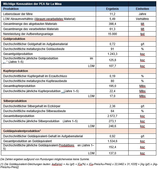 Gemäß der PEA wird die höchste Metallproduktion in den ersten fünf Produktionsjahren erzielt, mit einer durchschnittlichen Jahresproduktion von 152,4 Tausend Unzen Au-Äquivalent, bestehend aus 126 Tausend Unzen Au, 22,4 Millionen Pfund Cu und 273 Tausend Unzen Ag. Die Produktion im ersten Jahr von 176,5 koz AuEq umfasst 138 koz Au, 27,0 Mio. Pfund Cu und 174,8 koz Ag. Die durchschnittliche Produktion über die gesamte Lebensdauer der Mine (LOM) beträgt 137,0 koz AuEq, bestehend aus 107,7 koz Au, 17,0 Mio. Pfund Cu und 248,6 koz Ag.