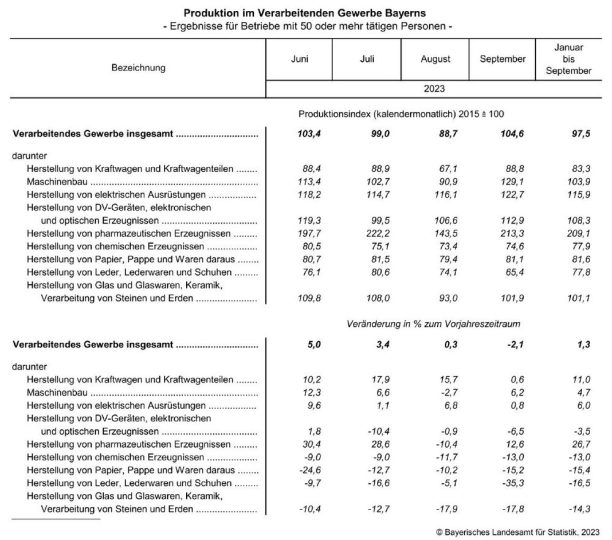 Nach Angaben des Bayerischen Landesamts für Statistik verzeichnet die Produktion des Verarbeitenden Gewerbes in Bayern im September 2023 gegenüber dem Vorjahresergebnis einen Rückgang von 2,1 Prozent. Die ersten neun Monate des…