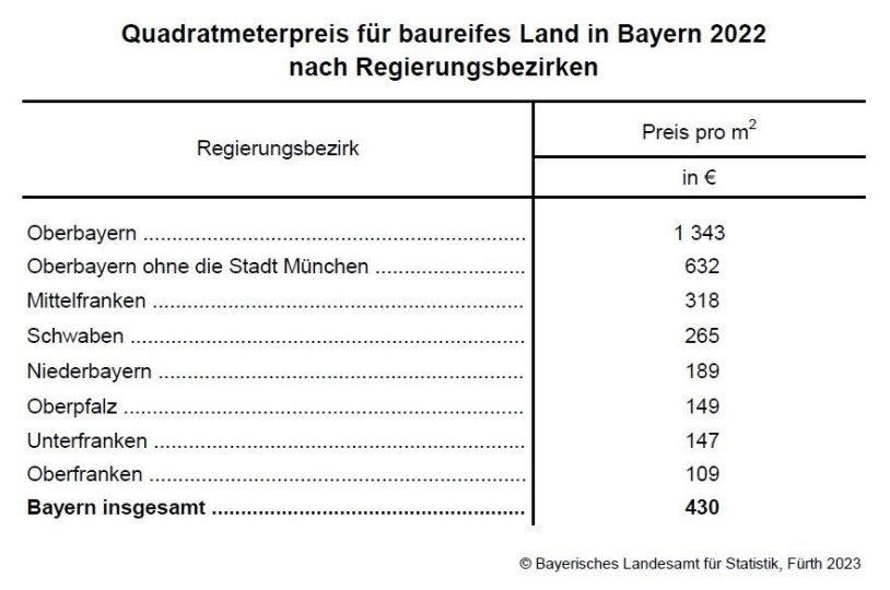 Der Quadratmeterpreis für die Verkäufe von baureifem Land beläuft sich in Bayern im Jahr 2022 im Durchschnitt auf 430 Euro. Dabei bestehen zwischen den einzelnen Regierungsbezirken große Preisunterschiede. Mit einem Preis von…