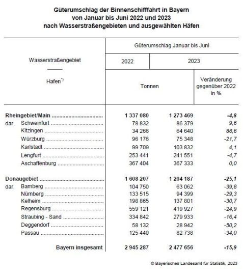 Der Güterumschlag der bayerischen Binnenschifffahrt liegt im ersten Halbjahr 2023 bei knapp 2,5 Millionen Tonnen. Das entspricht einem Rückgang um 15,9 Prozent im Vergleich zum entsprechenden Vorjahreszeitraum. Wie die Expertinnen…