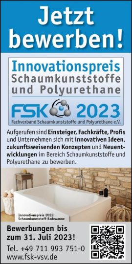 Das BewerberInnenportal ist geöffnet: Der Fachverband Schaumkunststoffe und Polyurethane (FSK) schreibt zum 3. Mal den Innovationspreis für Schaumkunststoffe und Polyurethane aus. Aufgerufen sind Nachwuchs – und Fachkräfte als auch Profis…