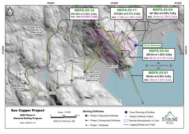 Sterling Metals Corp. (TSXV: SAG, OTCQB: SAGGF) („Sterling“ oder das „Unternehmen“) freut sich, über die neuen Analyseergebnisse aus seinem erweiterten und mittlerweile abgeschlossenen Bohrprogramm 2025 im Kupferprojekt Soo („Kupferprojekt Soo“ oder…