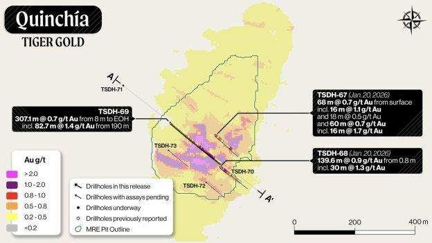 Tiger Gold Corp. (TSXV: TIGR, FWB: D150) („Tiger“ oder das „Unternehmen“) freut sich, die Analyseergebnisse des dritten Bohrlochs im Rahmen seiner laufenden Bohrkampagne auf der Lagerstätte Tesorito in seinem Goldprojekt…