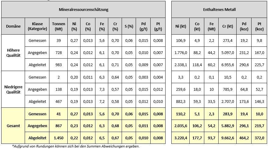 Gemessene und angezeigte Ressourcen: Anstieg um 46 % auf 2,1 Millionen Tonnen Nickel (0,87 Milliarden Tonnen mit 0,23 % Ni), einschließlich eines höhergradigen Bereichs von 0,77 Milliarden Tonnen mit…
