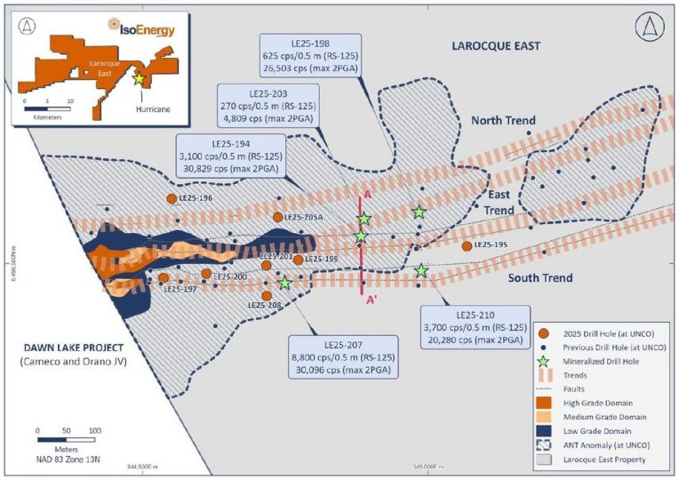 IsoEnergy durchschneidet stark erhöhte Radioaktivität in mehreren Bohrlöchern unmittelbar entlang des Streichs von Hurricane und im Step-Out-Zielgebiet D, 2,8 km östlich