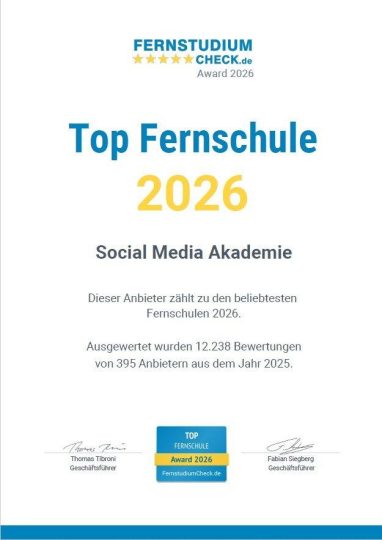 Neun Jahre in Folge ausgezeichnet: Social Media Akademie von WEKA Media ist auch 2026 „TOP-Fernschule“