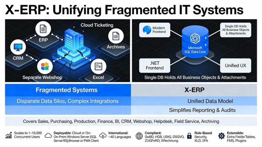 Fragmentierte IT-Landschaften sind in vielen Unternehmen immer noch Alltag: ERP hier, CRM dort, Webshop separat gehostet, Ticketsystem in einer Cloud, Archivsystem on top – plus unzählige Excel-Dateien und E-Mail-Postfächer. X-ERP…