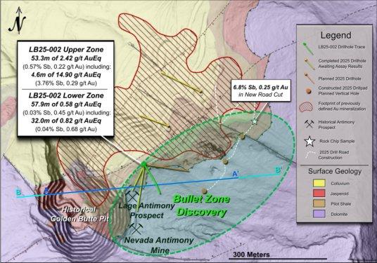 NevGold entdeckt hochgradige Oxid-Antimon-Zone „Bullet Zone“ ab der Oberfläche in den Step-Out-Bohrungen 2025: 14,90 g/t AuÄq über 4,6 Meter (3,76 % Antimon und 0,29 g/t Au) innerhalb von 2,42 g/t AuÄq über 53,3 Meter (0,57 % Antimon und 0,22 g/t Au) auf